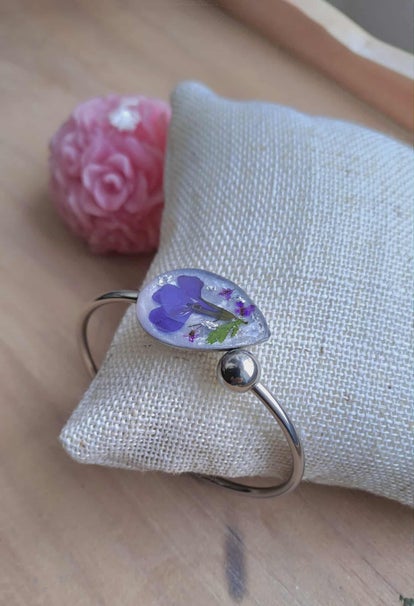 Ajoutez une touche de poésie à votre poignet avec ce délicat bracelet orné de véritables fleurs séchées de Lobelia, soigneusement incluses dans une résine cristalline et particules de feuilles argent.