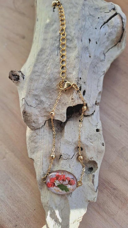 Apportez une touche de nature et de délicatesse à votre poignet avec ce bracelet raffiné. Son médaillon ovale en résine transparente renferme de véritables fleurs séchées de Lantana rouge, minutieusement sélectionnées et figées à jamais pour préserver leur beauté naturelle.