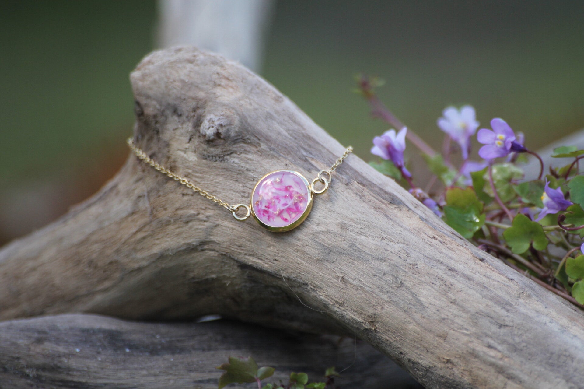 Bracelet composé d'un médaillon, mélange de fleur Gypsophile sur fond blanc et morceaux de feuilles d'or