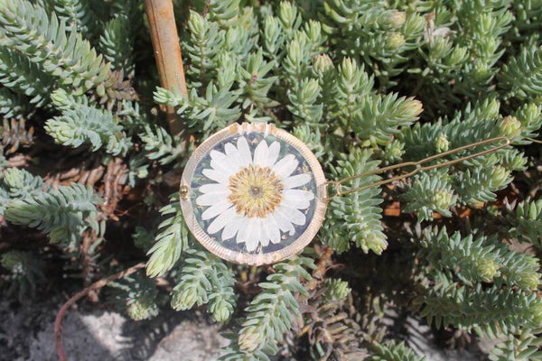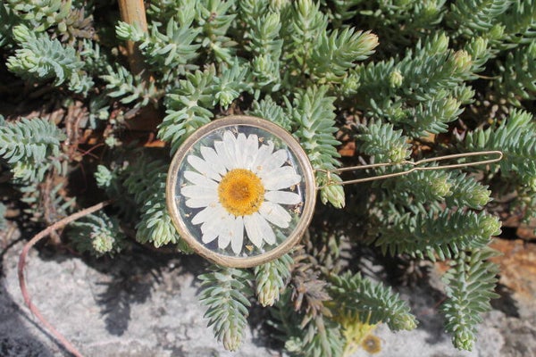 Pince à cheveux ou bijou à cheveux, fleur de Marguerite et morceaux de feuilles d'or