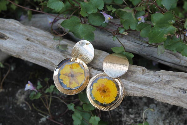 Boucles d'oreilles pendantes fleurs de Bouton d'or et feuilles d'or