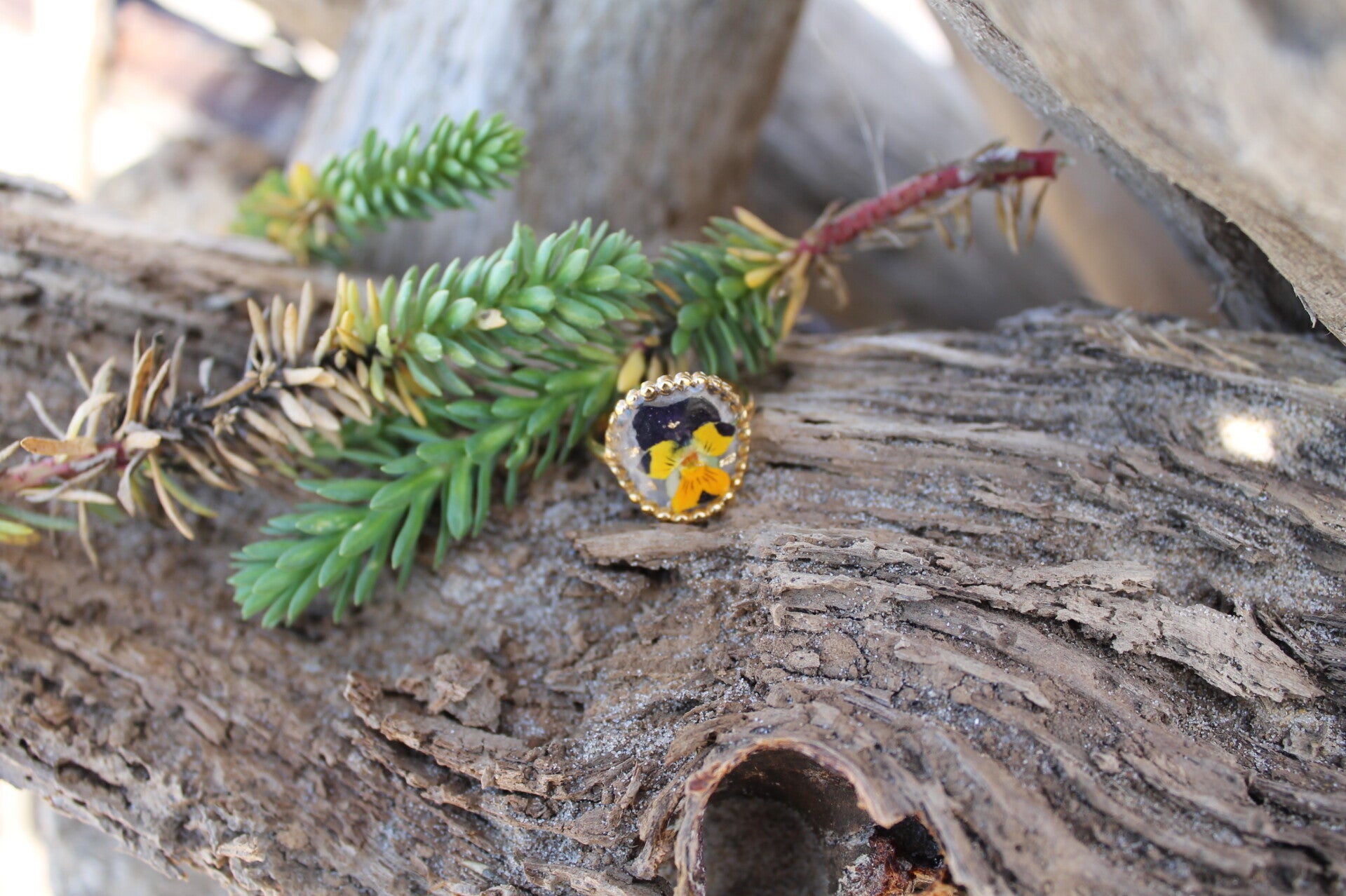 Bague fleur de Pensée et morceaux de feuilles d'or