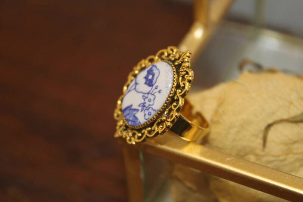 La bague dorée est une création artisanale unique réalisée à partir d'un fragment d'assiette ancienne orné d'un délicat motif floral bleu.