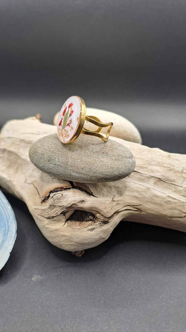 Bague cabochon, fleur de carotte rouge sur fond blanc, fougère et morceaux de feuilles d'or.