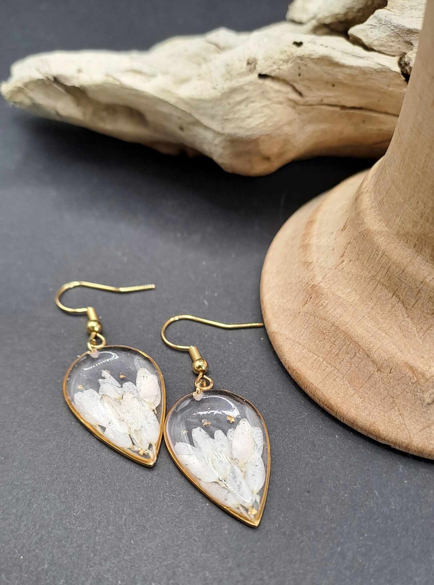 Matériaux : Les boucles d'oreilles sont faites à partir des pétales de fleurs de Paquerettes séchées encapsulées dans de la résine et montées sur des supports en acier inoxydable.