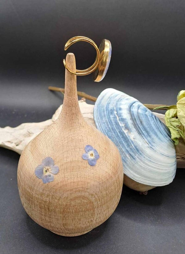 Bague cabochon, fleurs de Véroniques sur fond blanc et morceaux de feuilles d'or.