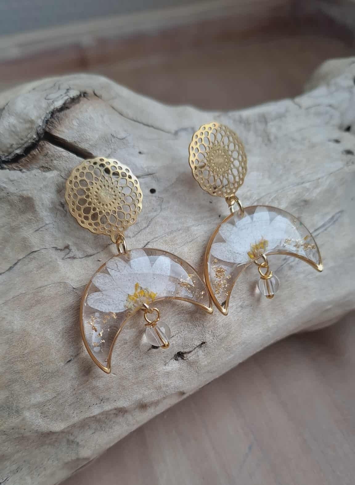 Boucles d'oreilles fleurs blanches, particules feuilles d'or