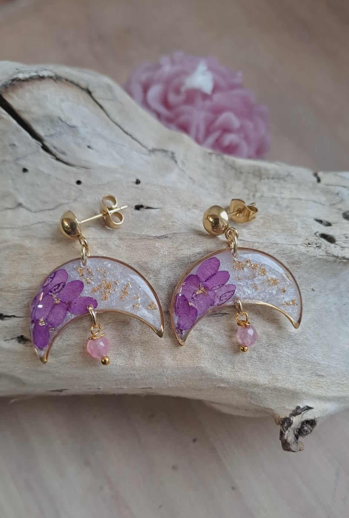 Boucles d'oreilles fleurs séchées, particules de feuilles d'or