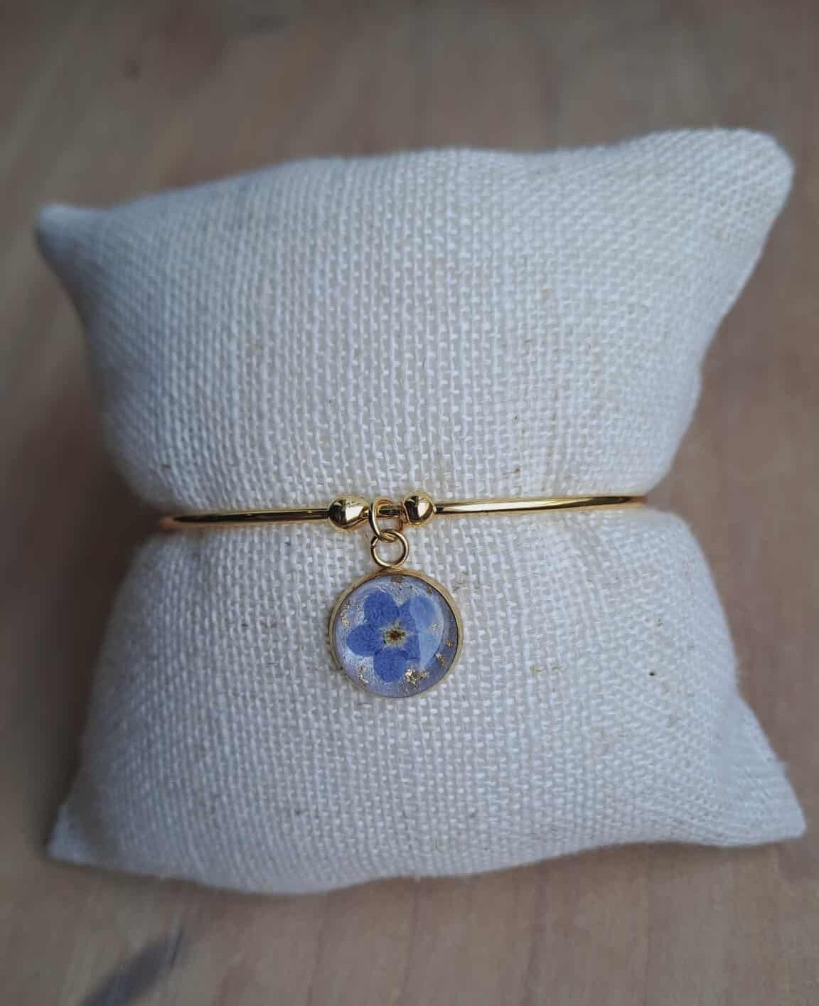 Ce bracelet jonc doré et orné d'un médaillon rond unique renfermant une véritable fleur de Myosotis séchée, sublimée par quelques éclats dorés.
