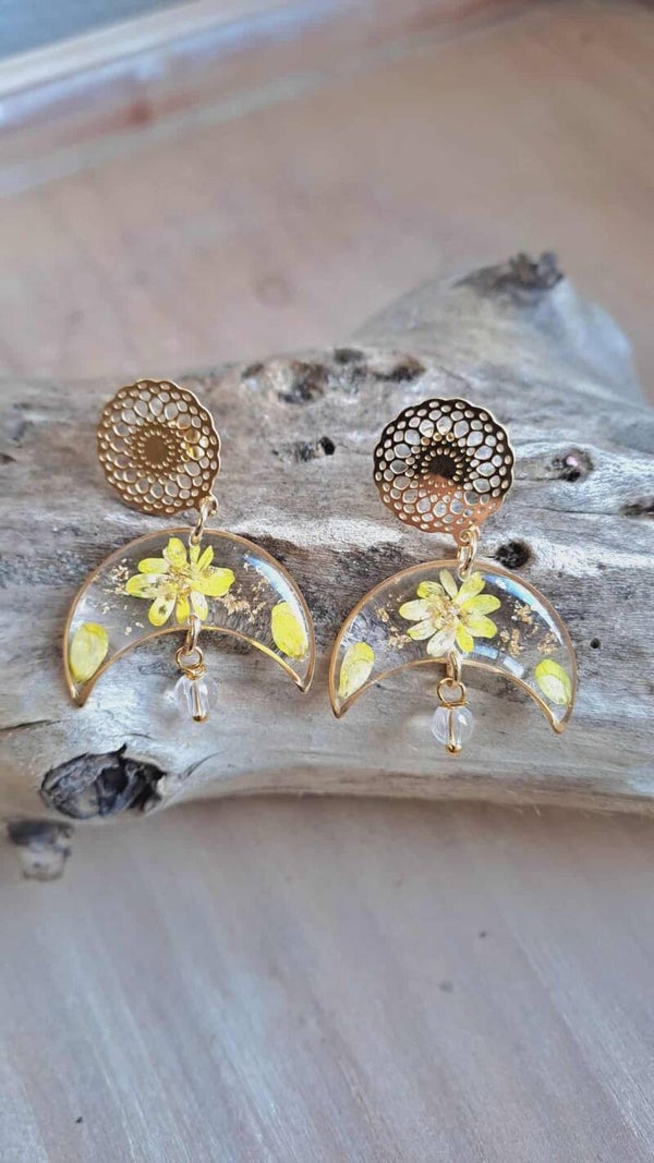 Boucles d'oreilles fleurs séchées Kalanchoé, particules de feuilles d'or