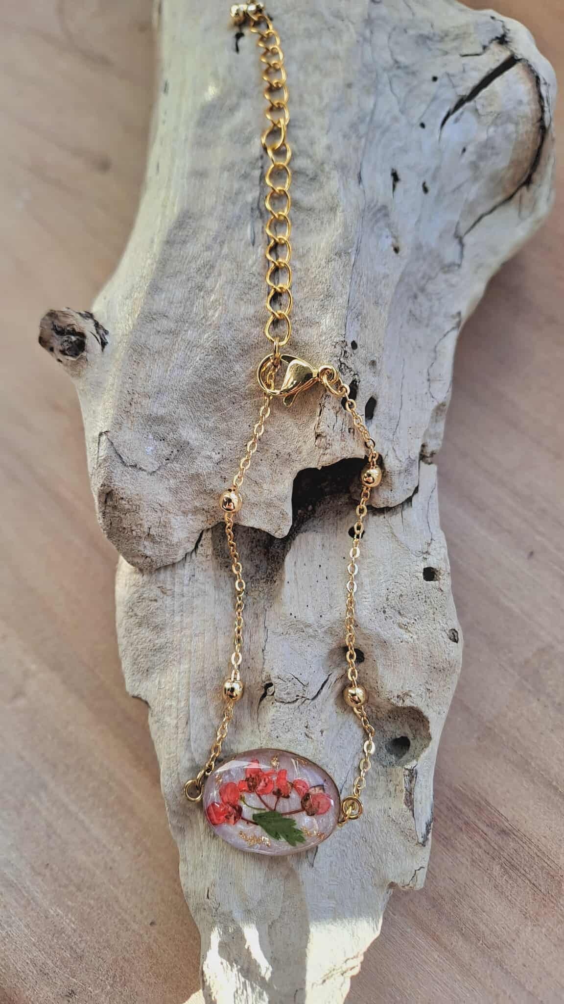 Bracelet doré avec fleurs séchées de Lantana rouge