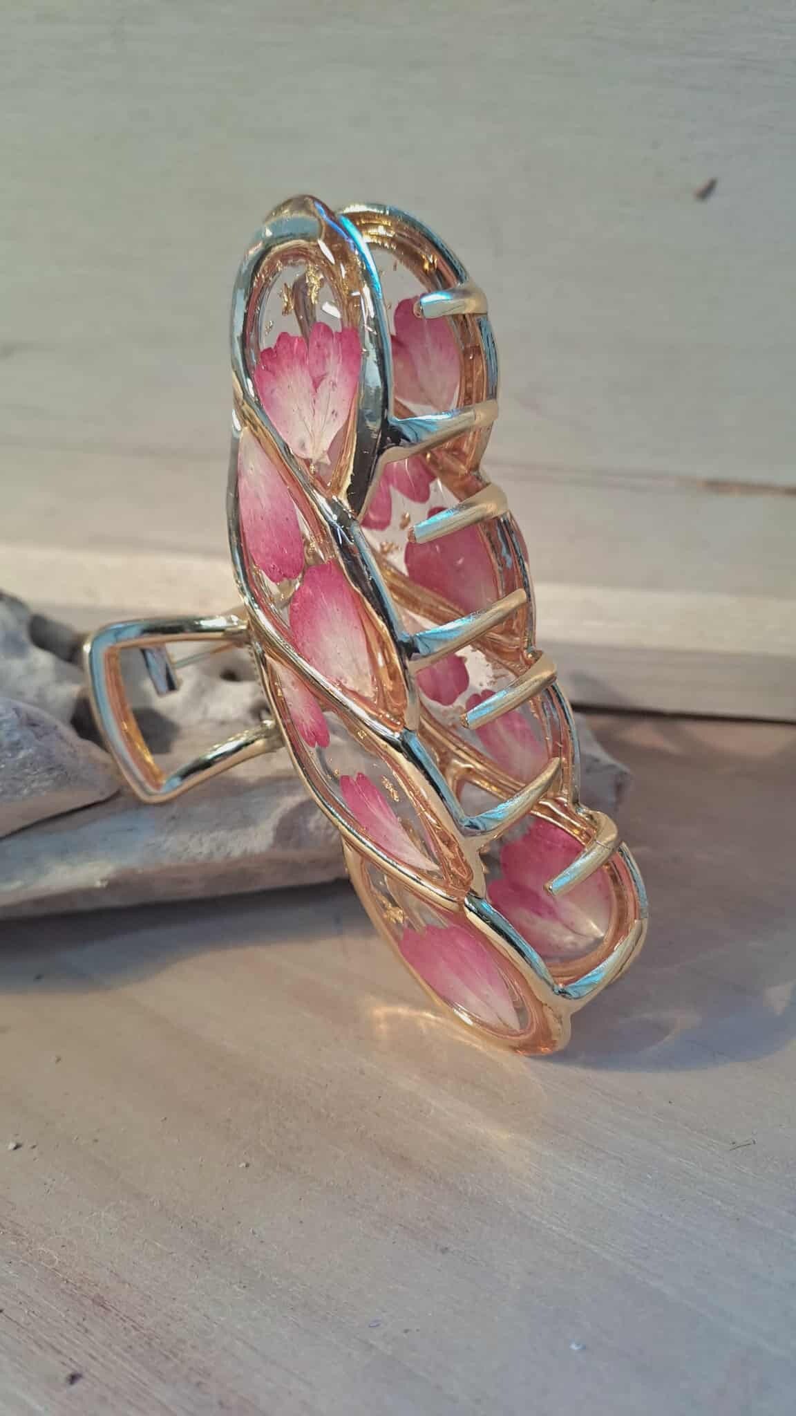 🌸Pince forme torsadée, réalisée à la main avec de véritables fleurs séchées de pétales de roses rouges et de particules dorées encapsulées dans une résine transparente et un cadre doré brillant.🌿✨