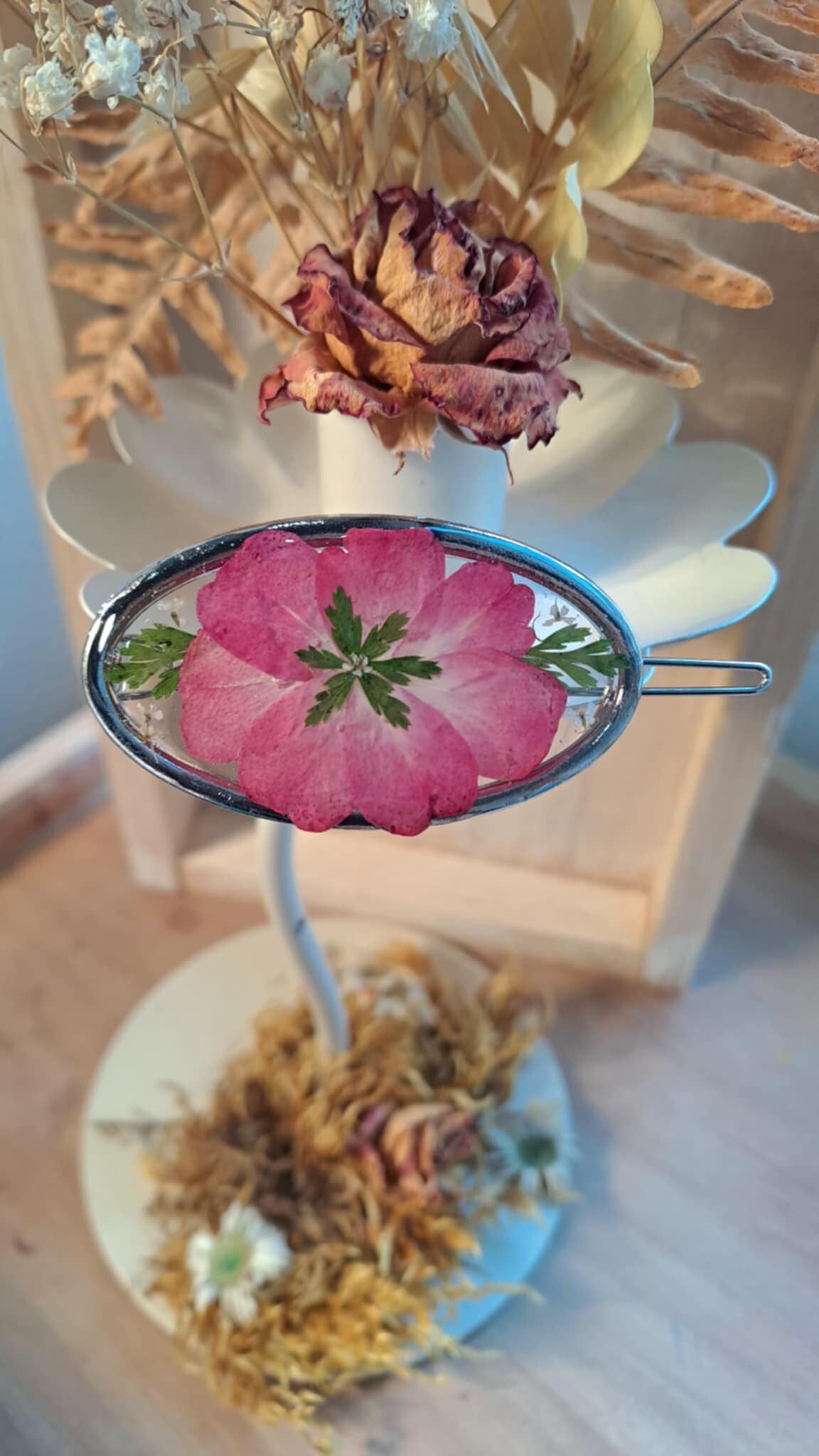 Bijou de cheveux en fleur séchée de rose- Résine et métal argenté